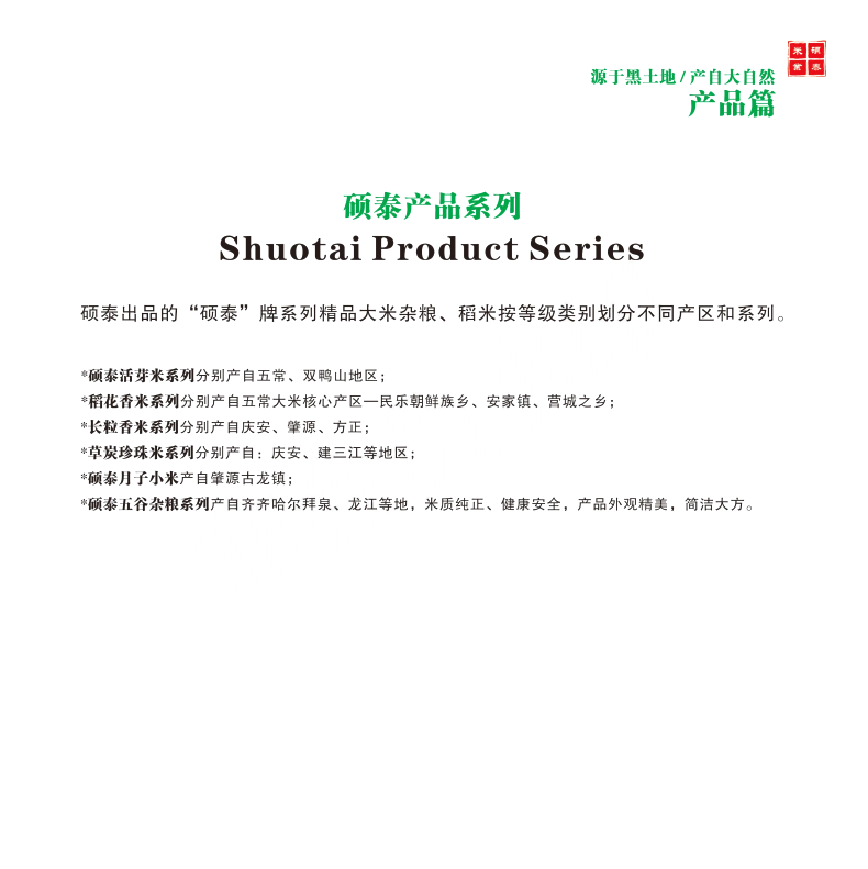 碩泰大豆雜糧及普通水稻種植基地:齊齊哈爾拜泉縣興農(nóng)鎮(zhèn)/方正縣松南鄉(xiāng)/慶安縣久勝鎮(zhèn)/肇源市新站農(nóng)場(chǎng)/舒蘭平安鎮(zhèn)
